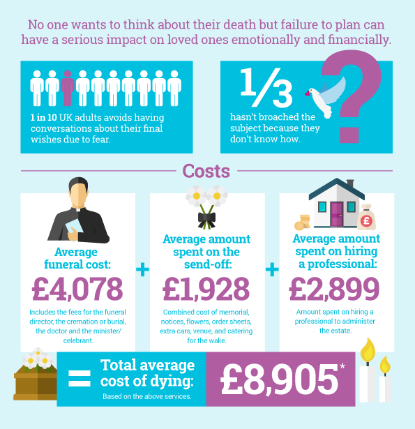 Not only is it important that you share your funeral wishes to ensure you have the perfect send off, it’s also important that you have considered how your funeral will be paid for. According to research undertaken in 2017*, the average cost of dying today is £8,905. This is based on the average funeral cost being £4,078, the average price of a send off at £1,928 and the cost of a funeral director at £2,899.
