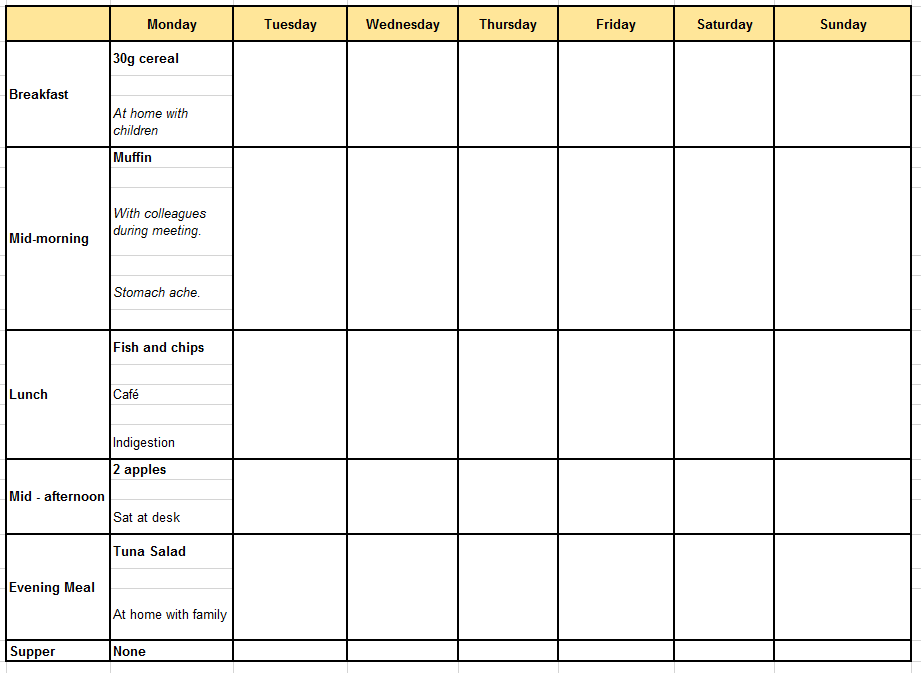 The NHS suggests keeping a food diary to help you to detect possible food intolerances, ‘There are no tests for food intolerances, the only way to know if you have one is to monitor your symptoms and the food you eat. Try keeping a food diary, noting what foods you eat, any symptoms you have after eating these foods and when these symptoms come on.’
