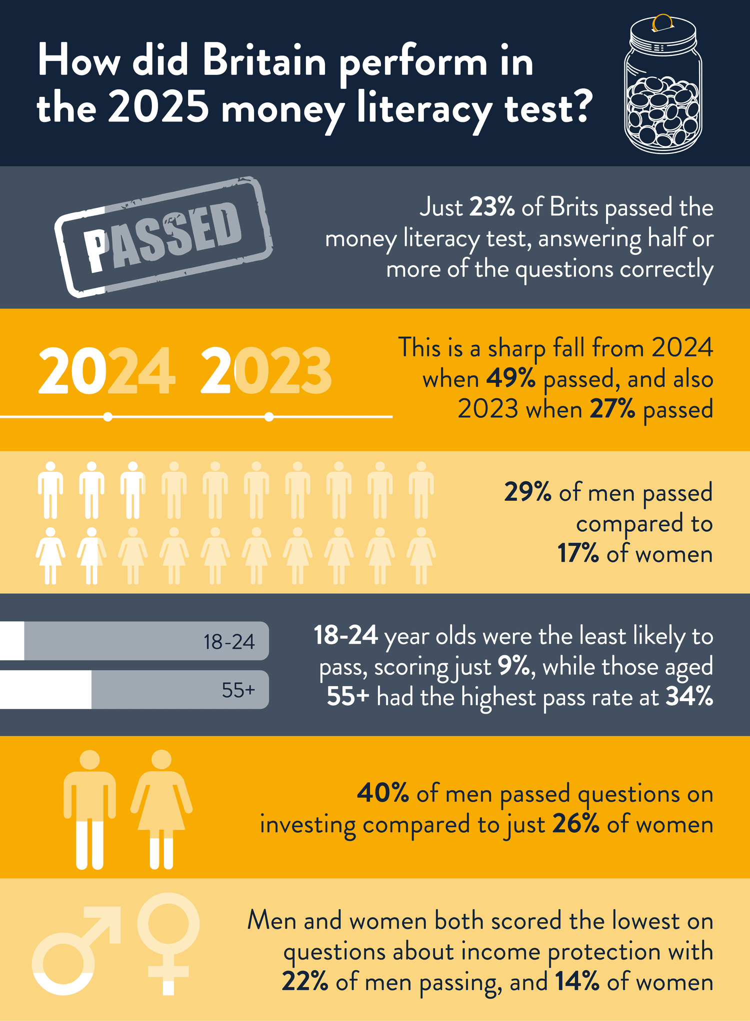 This year’s results show a noticeable drop in financial knowledge across the UK. Our 2025 Money Literacy quiz found that only 23% of respondents passed, meaning fewer than one in four Brits answered at least half of the questions correctly. This marks a sharp fall from 49% in 2024 and is even lower than the 27% pass rate recorded in 2023, suggesting that financial understanding has slipped.