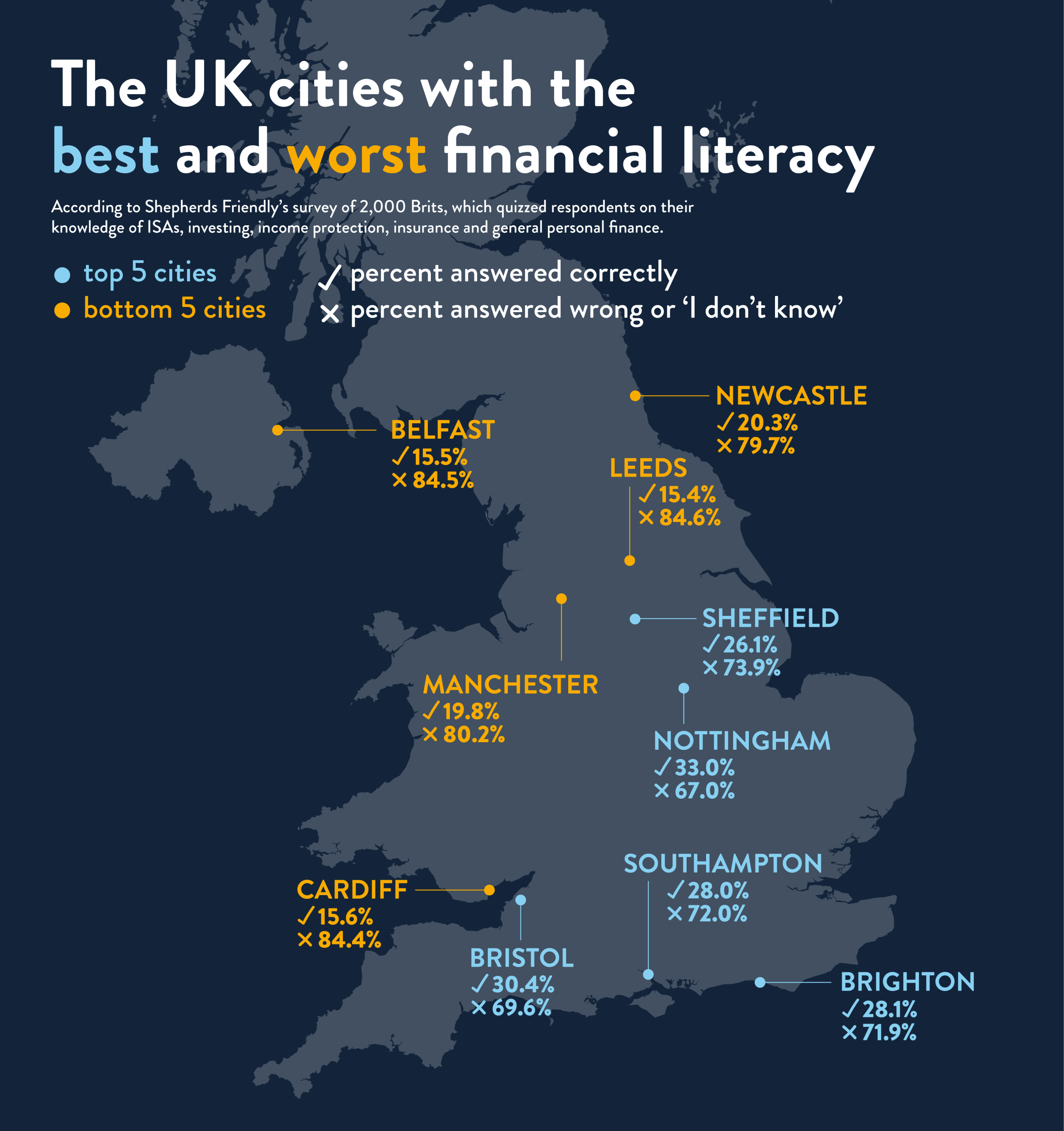 Our research has found that residents in Nottingham are the most financially literate, with a third answering half or more of our questions correctly. Bristol came in second place, followed by Brighton in third.