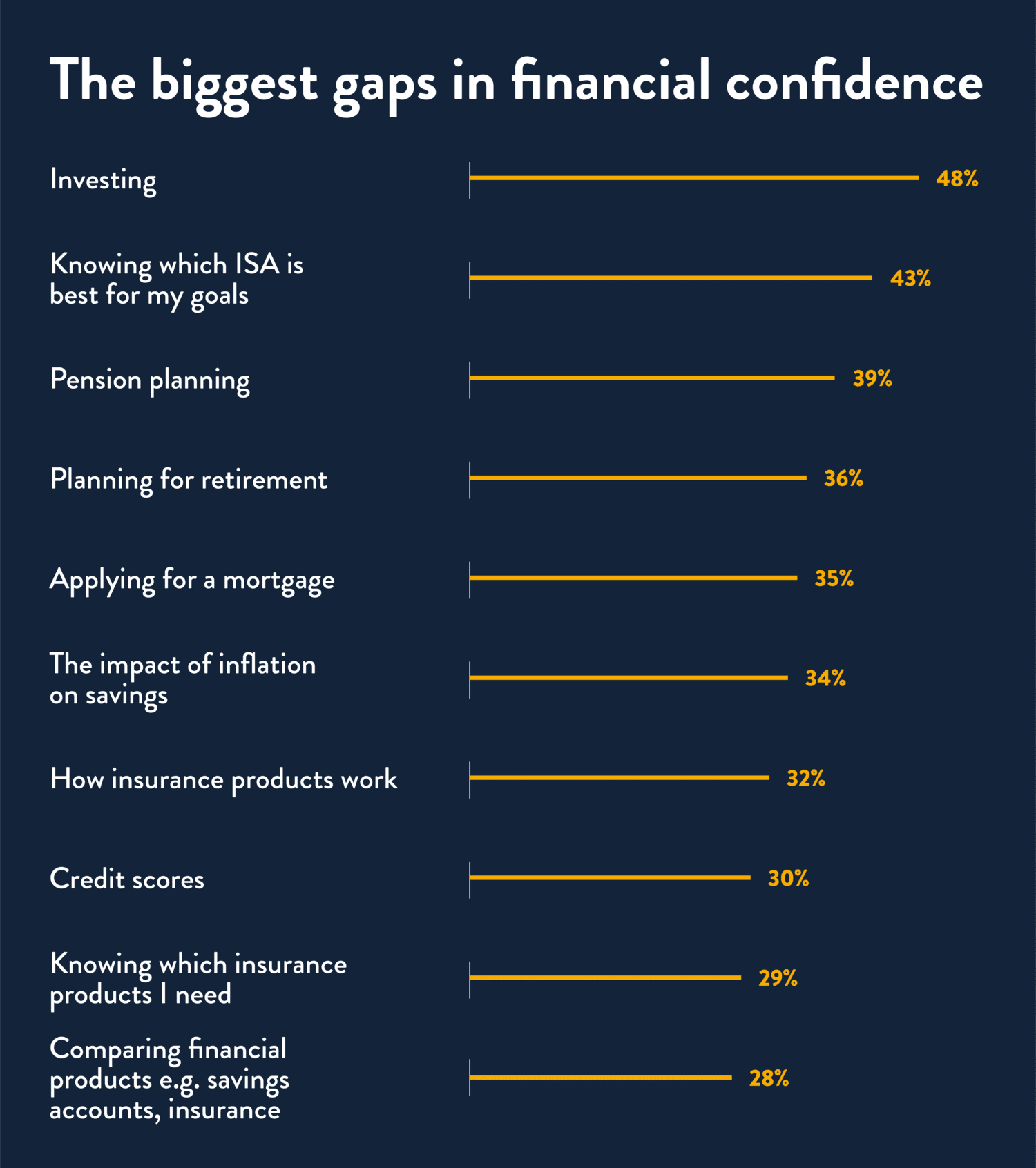 Asking adults how confident they are about different areas of personal finance, investing came out on top (48% not confident), followed by choosing the right ISA for their goals (43%) and planning for retirement (39%).