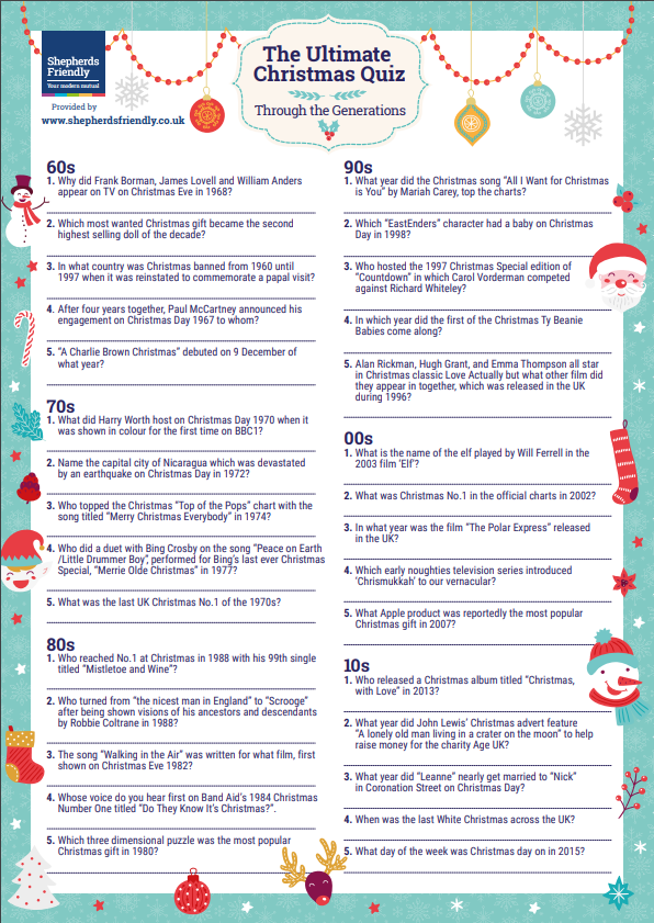 The Ultimate Christmas Quiz has six sections all that have questions related to Christmas from that era. The quiz includes music, film, celebrity questions and more.